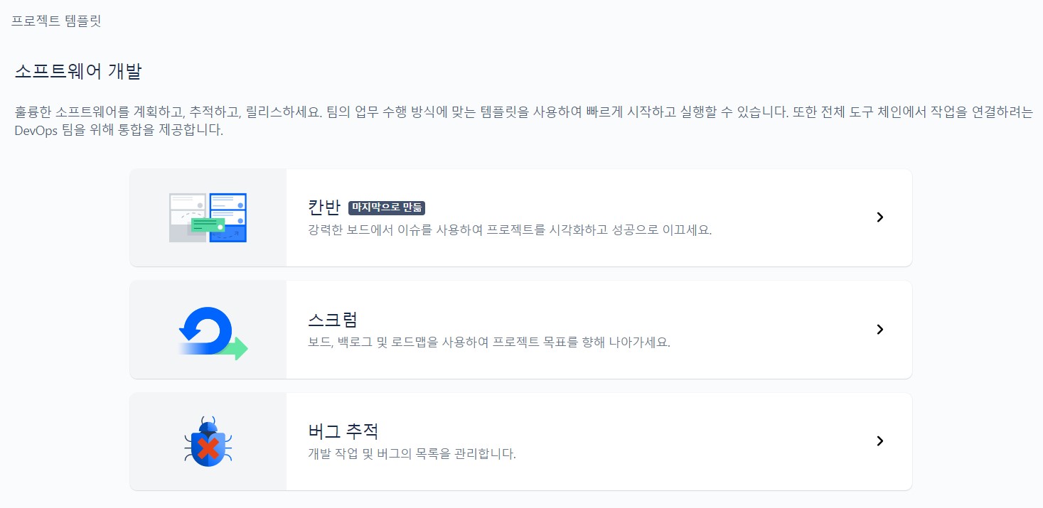 Jira는 애자일하게 일할 수 있도록 돕는 관리도구이다. 스크럼 보드, 칸반 보드, 로드맵 등 애자일 방식에 필요한 기능이 제공된다. Jira에서 앞서 살펴본 애자일하게 일하기 위한 12가지 원칙을 지키기 위한 기능이 있을지 함께 살펴보자. 우선 확인을 위해 Jira에서 프로젝트 템플릿을 선택해보자.