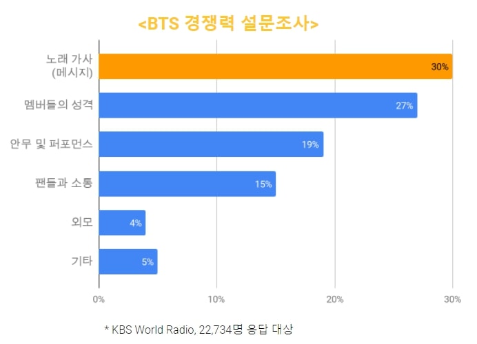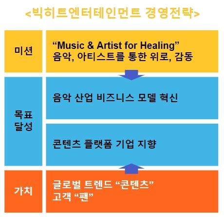 ▶ 빅히트의 경영전략과 BTS의 특성이 일치한다는 점이 놀라웠다. 나는 그저 'BTS가 가사를 잘 써서 많은 사람들이 공감하나보네.'라고만 생각했는데, 빅히트의 전략이 녹아든 것일 줄이야. 회사의 전략을 알고, 그 전략을 통해 목표를 달성할 수 있도록 나아가는 것이 중요하다는 점을 알게 되었다.