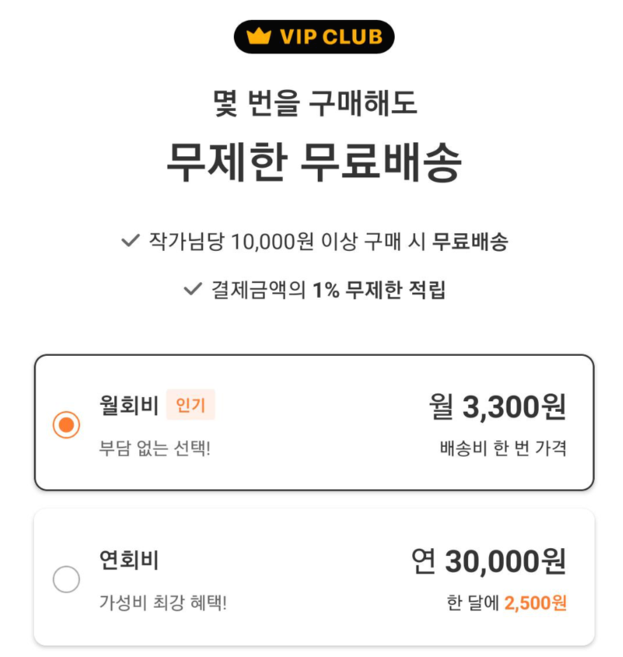- 월회비 혹은 연회비를 내는 VIP 클럽에 가입할 경우 무제한 무료배송의 혜택을 누릴 수 있다. (작가님당 10,000원 이상 구매 시)