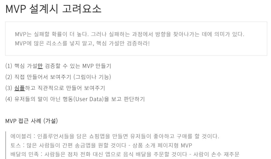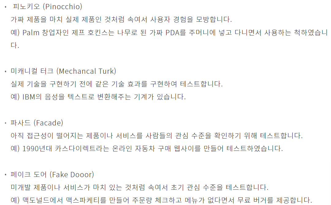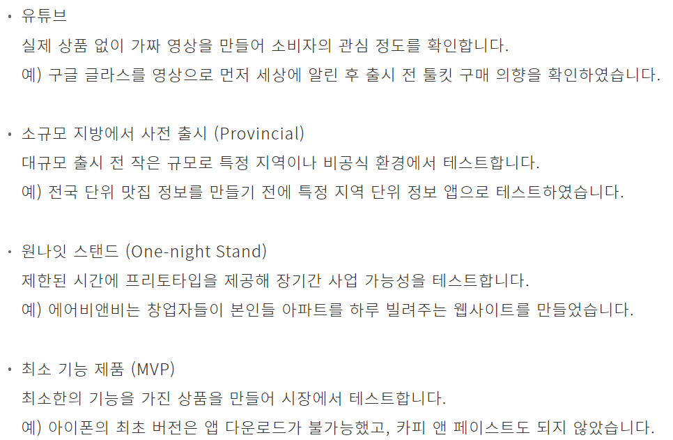 - 아이디어를 검증하기 위해서 꼭 실제 제품이 필요한 것만은 아니다. 오히려 간단한 테스트와 관찰을 통해 아이디어가 유효한지 확인한 후, 이를 정교하게 다듬어가는 것이 훠씬 효과적인 방법이 될 수 있다.