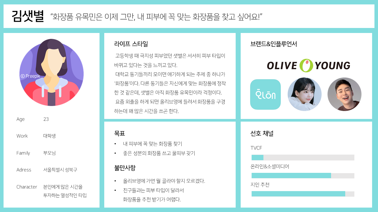 이에 더해서, 매번 새로운 화장품을 사용해보고 싶어하는 구매 유형을 가진 소비자, 다른 사람들이 직접 써본 솔직 후기를 알고 싶은 소비자 등을 목표 고객으로 선정할 수 있을 것이다.