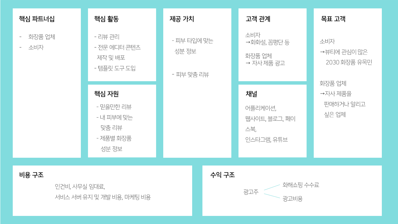 화해의 핵심 파트너는 목표 고객에서도 볼 수 있듯이 화장품 업체와 소비자이다. 화장품 업체는 화해가 매출을 낼 수 있도록 각종 수수료와 광고비를 지급하고, 소비자는 화해의 핵심 자원인 리뷰를 제공하기에 두 대상 모두 핵심 파트너로 볼 수 있다.
