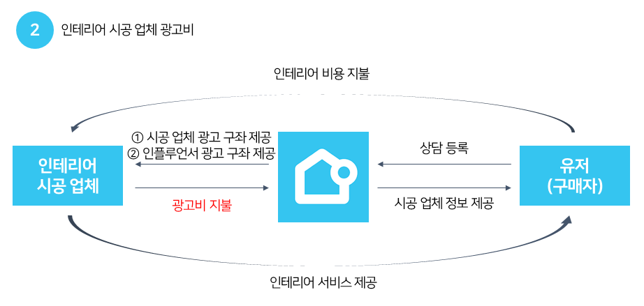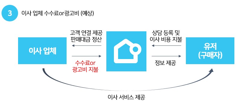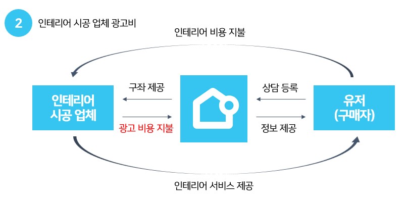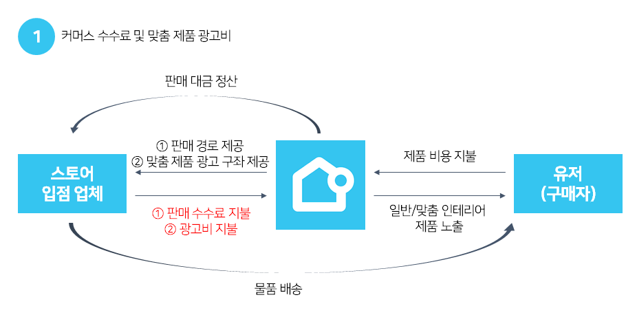 오늘의집 수익구조는 3가지로 유추해볼 수 있다. 첫째, 커머스를 통한 판매 수수료, 둘째, 인테리어 시공 업체의 광고비용, 셋째, 이사 업체 수수료로 추측된다.