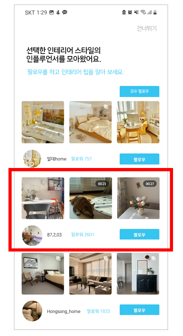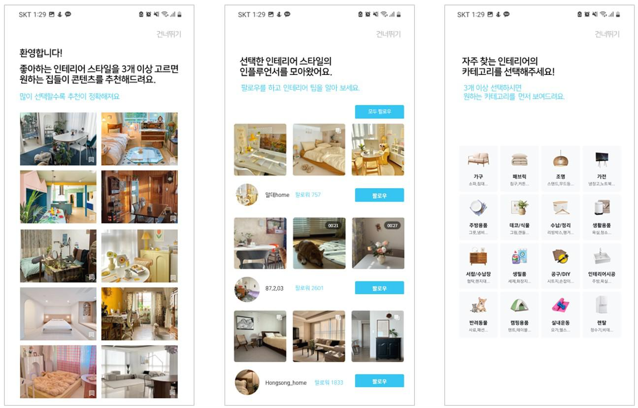 회원가입 시 유저들이 보게 될 화면은 위와 같다. 먼저 본인의 취향이 담긴 '인테리어 스타일'을 3개 이상 고르도록 유도한다. 그 다음으로 선택한 인테리어 스타일의 인플루언서를 차례로 배치하여 피드를 팔로우하도록 제안한다. 마지막으로 본인이 좋아하는 인테리어의 카테고리를 선택하게 한다. 단, 모든 과정은 건너뛰기가 가능하게 구성하여 해당 과정이 불편한 유저는 넘어갈 수 있도록 한다.