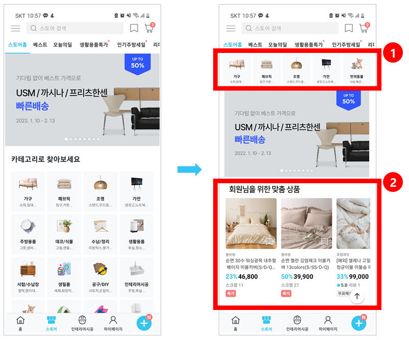 기존 스토어홈에서는 카테고리를 왼쪽 상단의 햄버거 메뉴에서도, 그리고 중앙에서도 선택할 수 있다. 이미 왼쪽 상단의 햄버거 메뉴를 클릭해서 카테고리 별로 제품을 찾을 수 있으니, 홈 화면에서의 비중은 줄여서 1번처럼 위쪽에 위치하게 한다. 그리고 회원가입 시 선정했던 인테리어의 카테고리 순서에 따라 배치할 수 있게끔 한다.