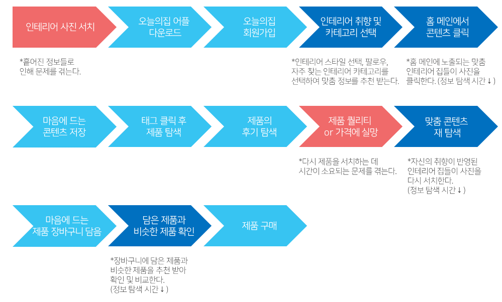 ▶ 오늘의집의 필터가 세분화되어 있어서 제품을 찾기는 쉽지만, 고객이 원하는 제품을 직접 찾아야 하는 번거로움이 있다. 또한 이와 유사하게 고객여정지도를 그렸을 때에도 제품과 콘텐츠 서치를 하는데 시간이 다소 소요되는 pain point를 발견했다.