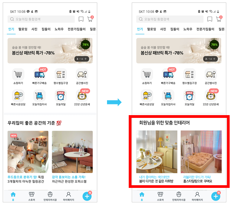 회원가입을 하고 나면 유저들은 홈화면을 보게 된다. 이때 기존처럼 유저 모두에게 동일한 콘텐츠가 노출되는 것이 아닌, 회원가입 시에 선택했던 인테리어 스타일과 유사한 인테리어 콘텐츠를 노출한다. 이와 더불어 전문가(인테리어 업체)의 인테리어 콘텐츠 노출도 가능하다.