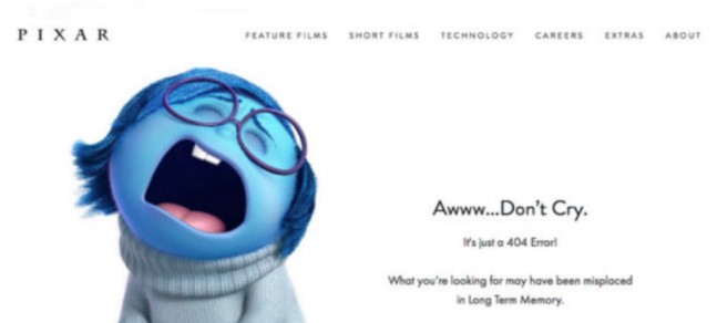 404페이지는 웹사이트를 탐색하는 사용자에게 발생할 수 있는 최악의 상황입니다. 어쩌면 재치 있는 카피는 그 상황을 비교적 긍정적으로 만들 수 있을 것입니다. Pixar는 일부 그래픽과 동정의 말을 사용하여 실망스러운 경험을 재미있는 경험으로 바꾸었습니다.
