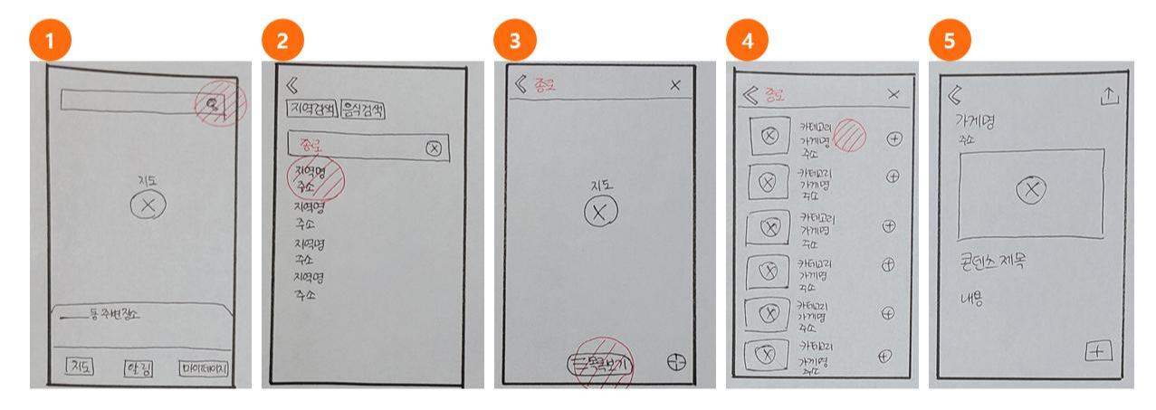 User Story를 해결하기 위한 푸딘코의 화면 흐름을 종이에 간단히 그려 보자.
