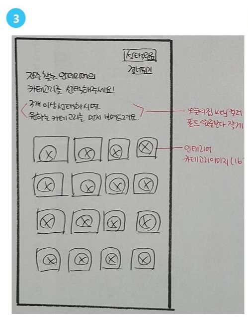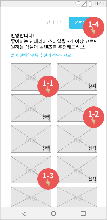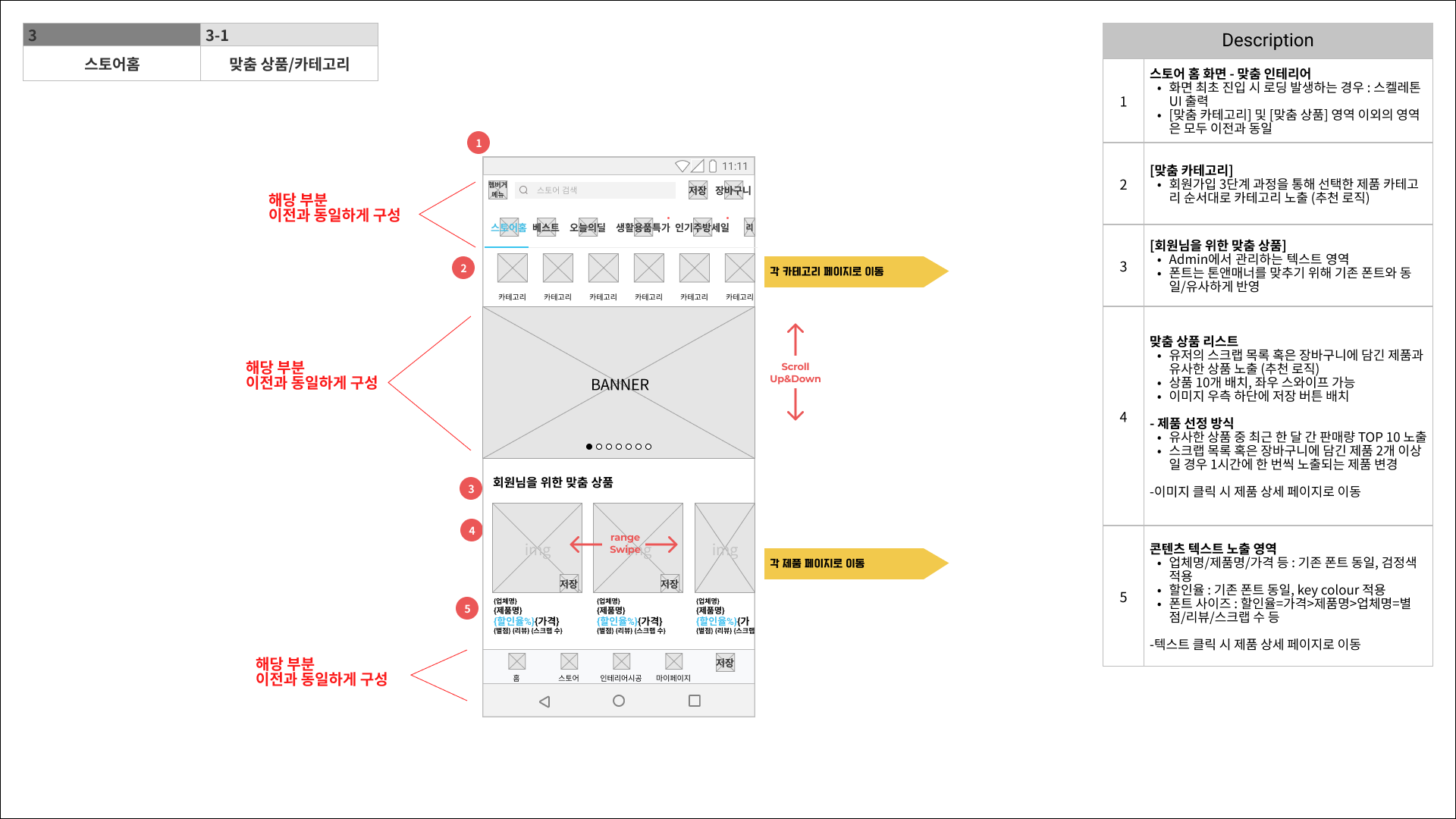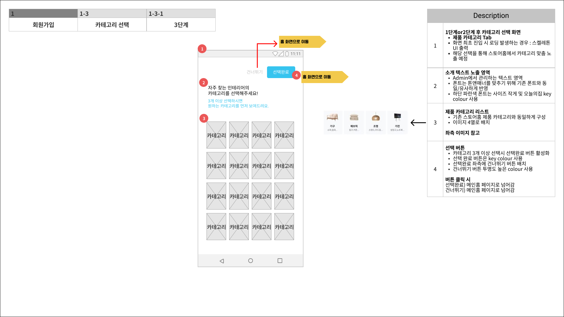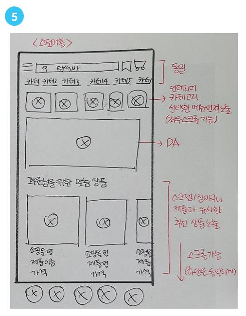 먼저 디자인 툴을 사용하기 전에 wireframe 을 직접 그려봤다. 1~3번은 회원가입 시 맞춤 추천을 받기 위해 고객의 취향을 수집하는 과정이다. 4번은 홈 화면으로 공통 인테리어 콘텐츠가 아닌, 회원별 맞춤 인테리어 콘텐츠가 제공된다. 5번은 스토어홈 화면으로, 회원의 선호 카테고리 순으로 상단에 카테고리가 배열되어 있다. 하단에서는 스크랩 혹은 장바구니에 담긴 제품과 유사한 제품을 맞춤 상품으로 추천한다.