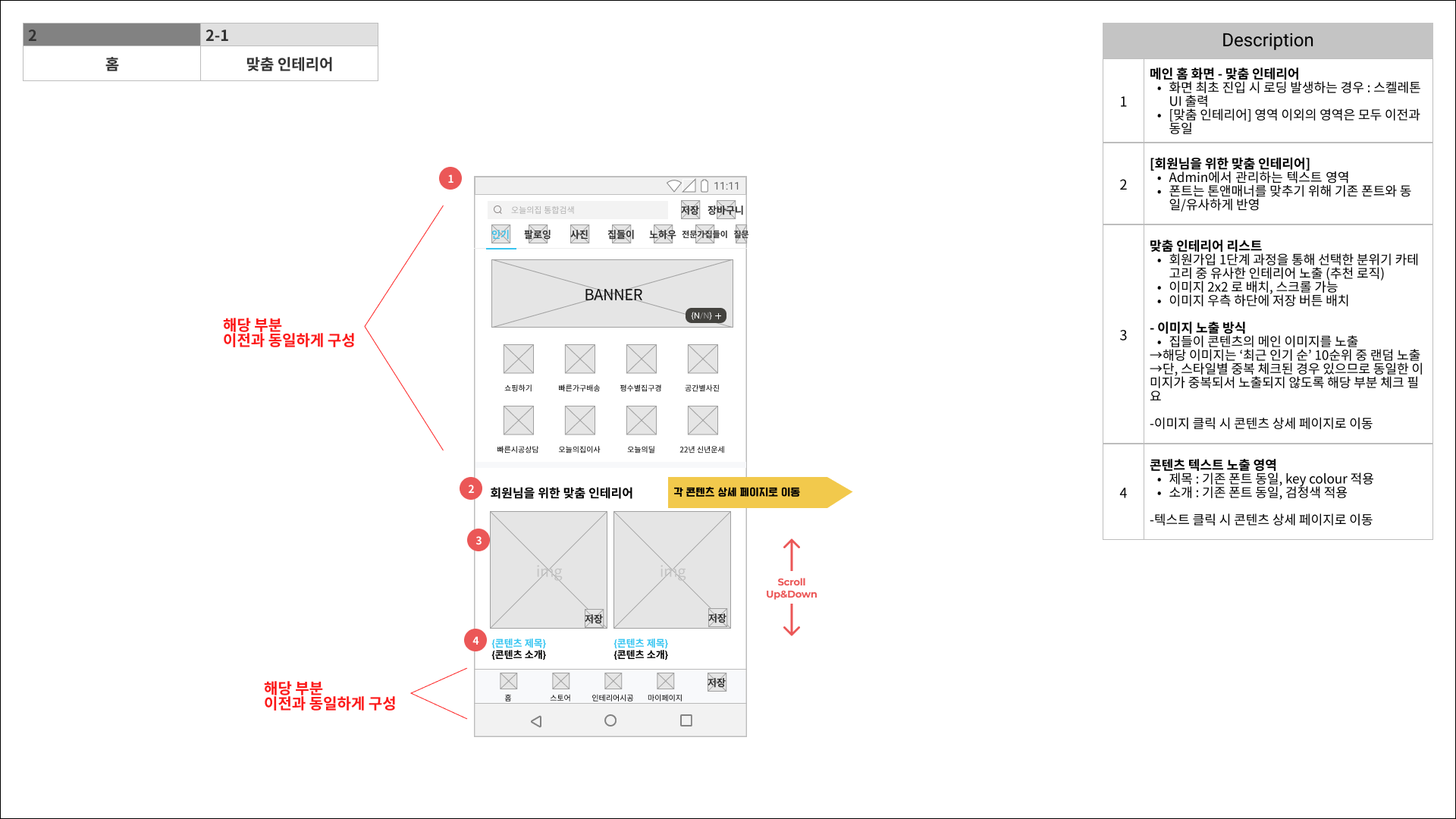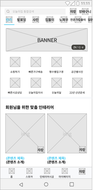 그중 '내 취향을 반영한 맞춤 인테리어 서비스'를 메뉴트리에 적용했을 때, [홈]의 [인기] 페이지에서는 [콘텐츠] 부분 중 동일 콘텐츠 대신 맞춤 콘텐츠가 제공된다. 그리고 [스토어]의 [스토어홈] 중 [카테고리] 부분의 구성 변동이 있으며, [맞춤상품] 영역이 추가되거나 교체될 것으로 예상된다.