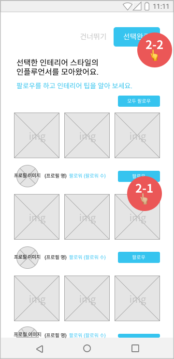 추가된 핵심 기능의 Depth와 구조를 한 눈에 파악하기 위해 오늘의집의 IA를 제작했다. 기획한 핵심 기능 파트는 빨간색과 보라색 점선으로 표시하였다. 그중 빨간색 부분은 회원가입 시 본인의 취향을 선택할 수 있는 새로 추가된 기능이다. 또한 보라색 파트는 기존에 제공되는 서비스를 대체하여 회원별 맞춤으로 제공되는 기능이다.