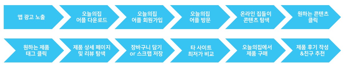 '오늘의집' 노출에서부터 제품 구매, 그리고 후기 작성에 이르기까지의 과정을 위와 같이 정리했다. 오늘의집의 주요 기능인 콘텐츠 내의 '태그' 기능을 활용했을 때의 프로세스이다.