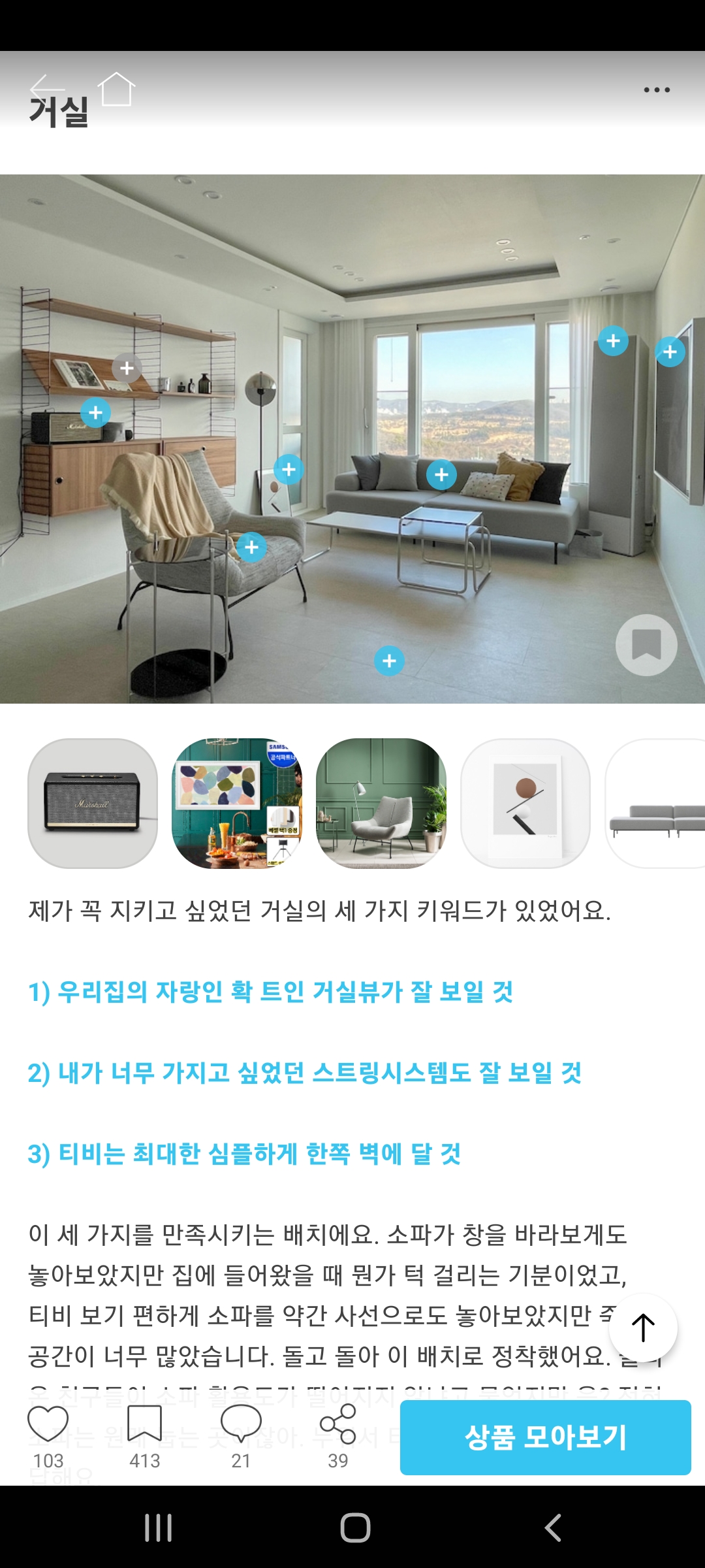 오늘의집은 인테리어 문제를 해결하고 싶어했다. 사람들이 오늘의집에서 인테리어와 관련한 모든 문제를 해결하고 나면 결국 이 공간에서 구매까지 이어지기를 원했을 것이다. 그리고 커머스로 이어지는 부분을 제품을 내세우는 것이 아닌제품 내의 태그로 배치함으로써 '이 인테리어 봐봐, 되게 예쁘지? 여기 제품 정보도 있어~'라는 형태로 자연스럽게 구매를 유도하는 전략을 펼쳤다.