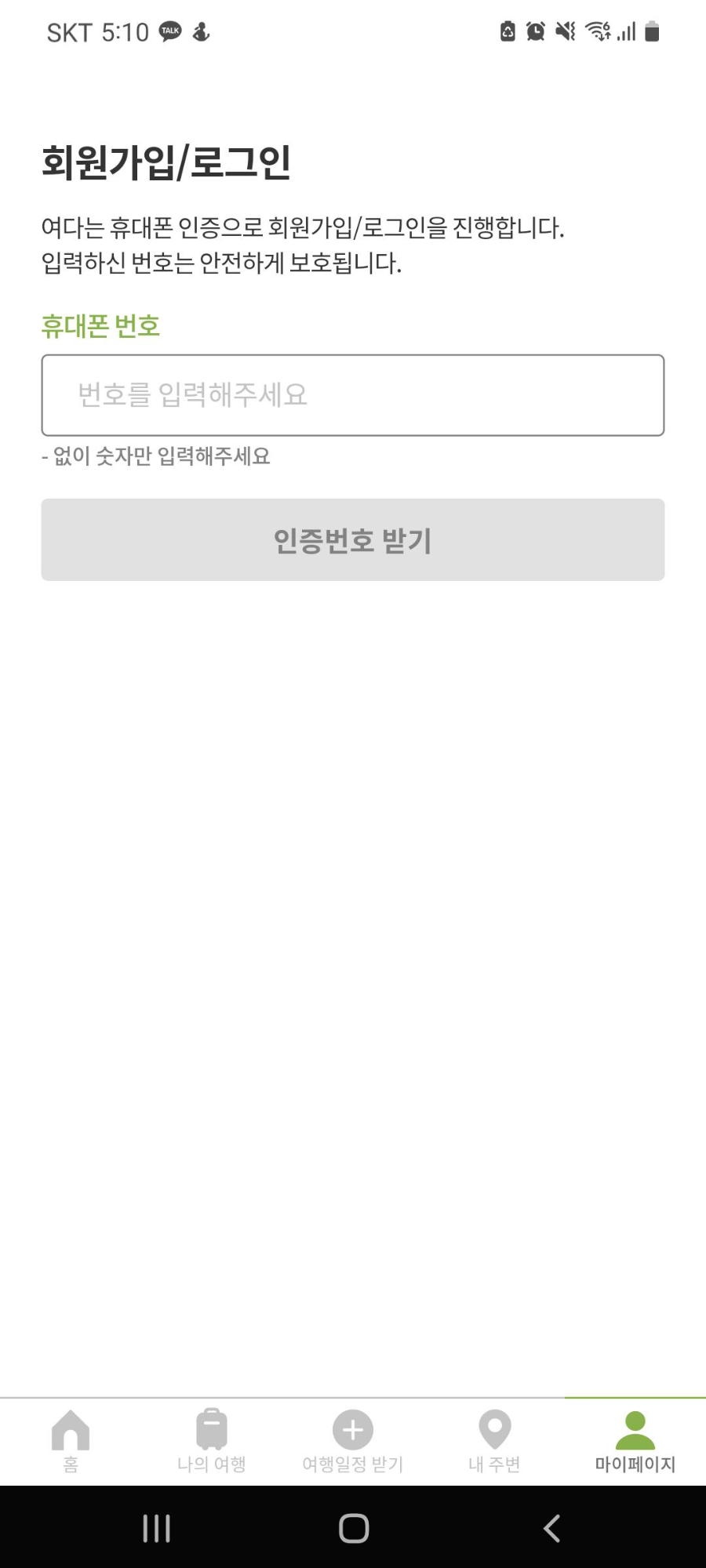 여다에서는 회원가입시 오직 휴대폰 번호라는 정보만 받는다. 단, 휴대폰 번호의 신뢰성 등을 파악하기 위해 인증번호를 입력해야 한다. 휴대폰 번호가 전달되면 바로 서버에서 인증번호를 전달하지 않을까 추측해본다. 그리고 추후 여행일정 완성 알림을 카카오톡으로 보내기 위해 번호를 해당 계정과 연동해놓을 것이라 생각했다.