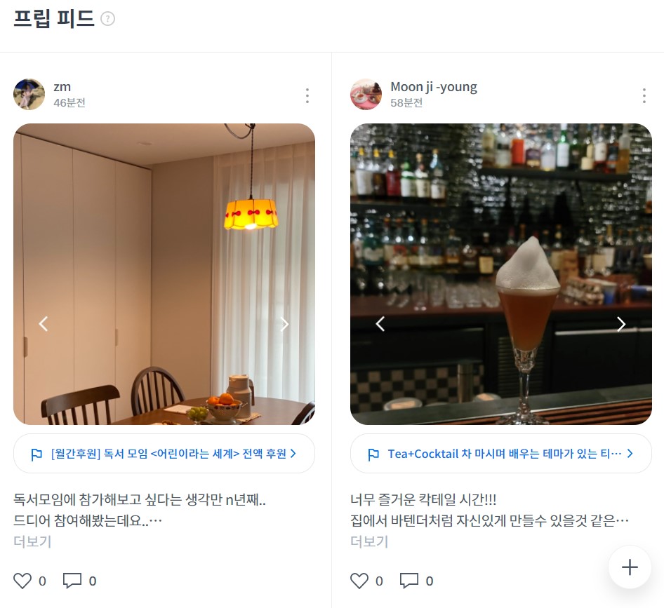 프립에서 유저들은 [프립 피드]라는 기능을 통해 콘텐츠를 제작하게 된다. (타 취미 플랫폼에서는 찾기 어려웠던 UGC가 프립에는 있다.) 일반적인 후기와는 달리 이미지를 무조건 추가해야 피드에 업로드할 수 있다. SNS에 업로드하는 것처럼 간단한 콘텐츠이지만 본인의 취미력을 뽐내고 기록할 수 있다는 점에서 매력적으로 다가올 수 있다고 느꼈다. 그리고 SNS와 같이 다른 유저들의 활동도 확인할 수 있어서 커뮤니티의 기능을 하기도 한다.