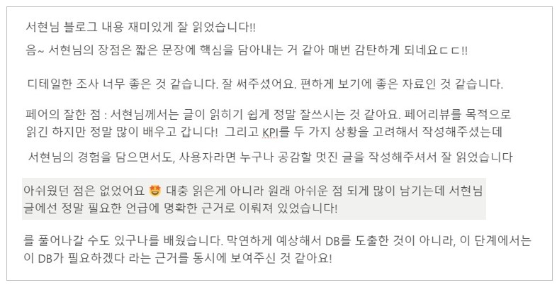 그리고 과제할 때 페어리뷰에서 볼 수 있는 동기분들의 따스하고 훈훈한 피드백..🥰