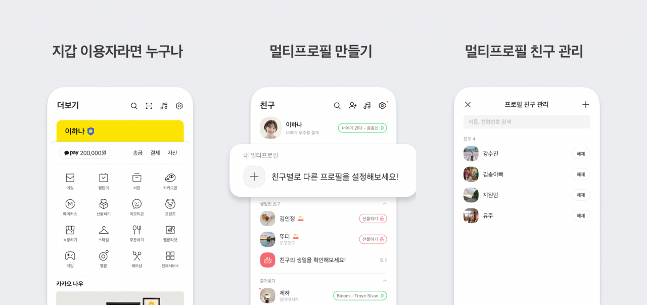 멀티프로필은 친구 목록에 있는 친구들에게 본인이 정한 프로필을 보여줄 수 있는 기능이다. 예를 들어 가족에게는 A프로필을, 친구에게는 B프로필을, 회사 동료에게는 C 프로필을 보이게 할 수 있다.