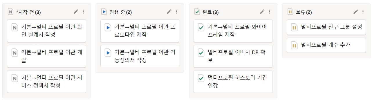 두 유저스토리 중 멀티프로필 개수 조정은 회의 과정에서 미루게 된 문제라고 가정하고, 1번 문제를 업데이트하는 중간 과정에 있다고 생각한 채 백로그를 칸반 보드로 작성했다. 개발 측면에서 세세한 내용은 현 상황에서 한계가 있기에 '개발'이라고만 포괄적으로 적어두었다. 그리고 이전 수업 내용을 통해 배운 서비스 기획 산출물에 대해서만 구체적으로 적었다.